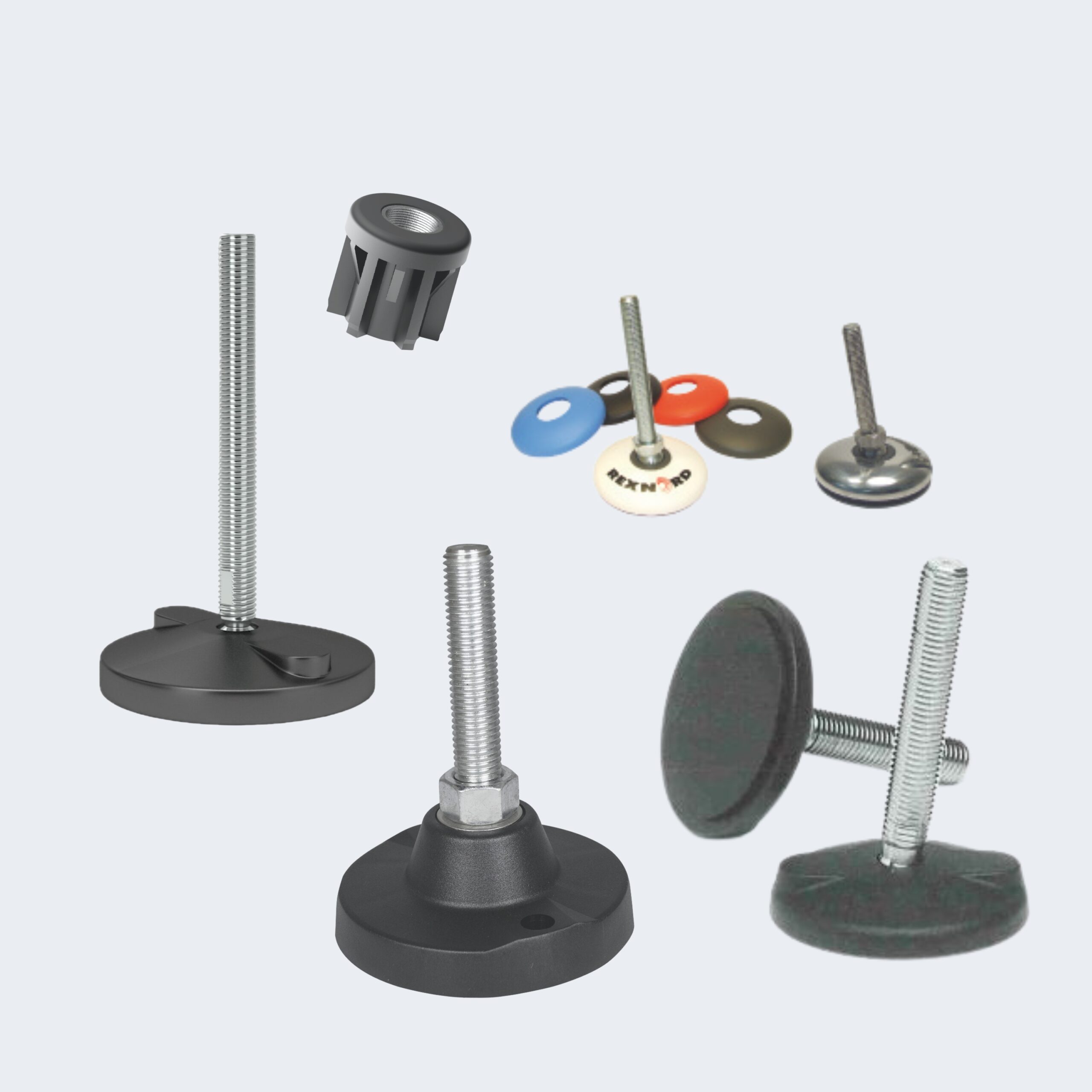 De stelvoeten met kunststof schotel zijn leverbaar in diverse afmetingen en configuraties, zodat zij eenvoudig kunnen worden afgestemd op de belasting en opstelling van de machine of conveyor.